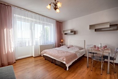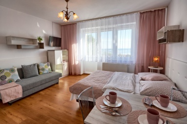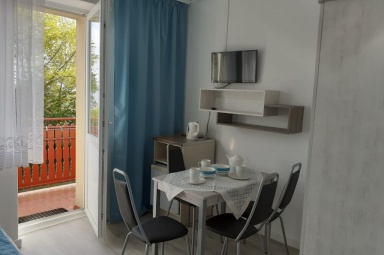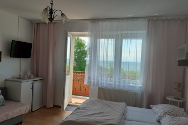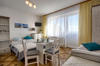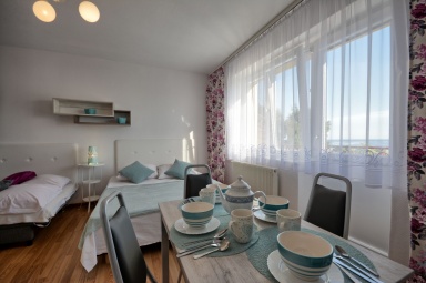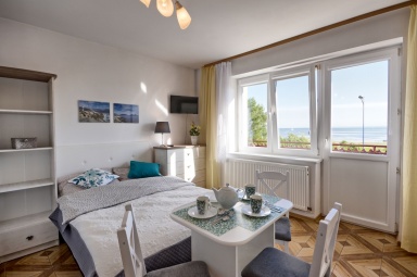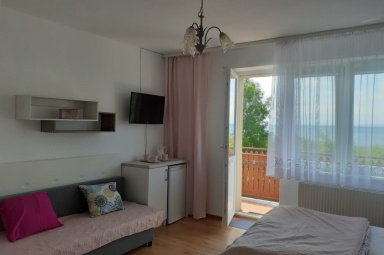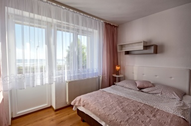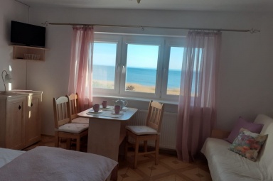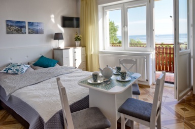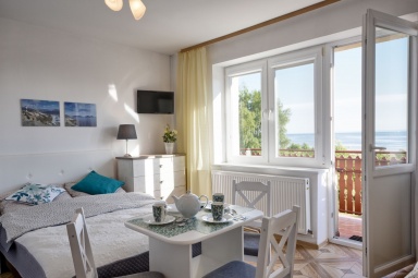 Pokoje 3 i 4 osobowe z balkonami z widokiem na zatokę, pokoje 2 osobowe z widokiem na las sosnowy.